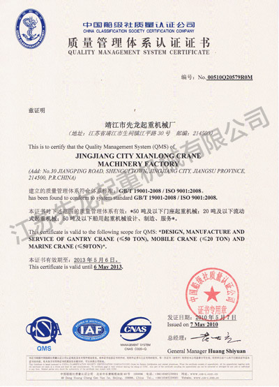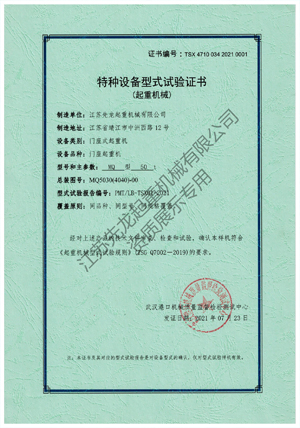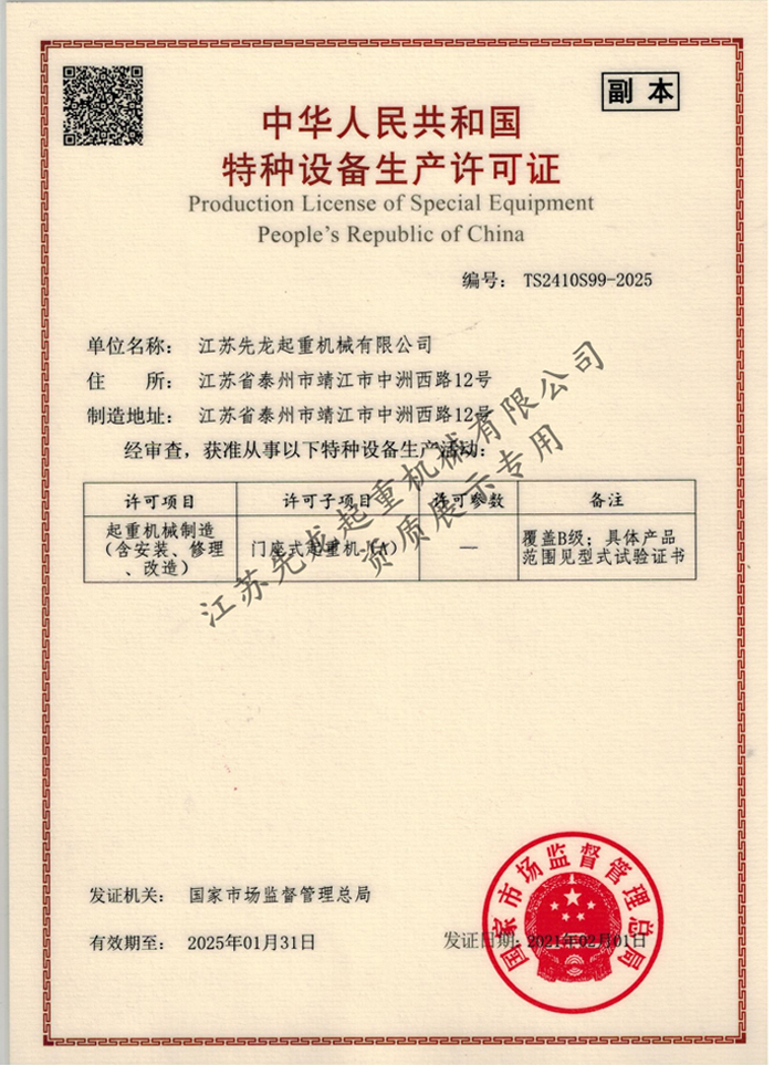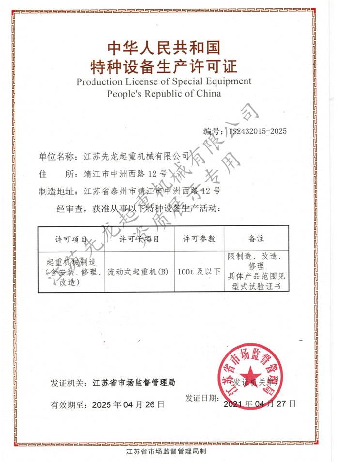 江蘇先龍起重機械有限公司(原靖江市先龍起重機械廠)是改制后的獨資企業,本廠是生產起重運輸機械的專業化企業,并先后通過了ISO9001:2000質量管理體系認證、獲得國家頒發的HGQ50T固定式起重機和DLQ20T輪胎式起重機的特種設備制造許可證、特種設備安裝維修改造許可證。